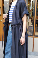Wearing it open adds a lighter feel, and pairing it with a striped inner layer adds an urban, casual nuance to this ethnic dress.