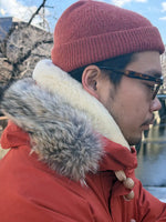 Made from almost 100% goose down, with a luxurious sheepskin collar, this jacket does not contain any down packs and conforms to the wearer's body, making it the ultimate down jacket. It does not have the bulkiness that is typical of down jackets, and its light and comfortable feel is unmatched.